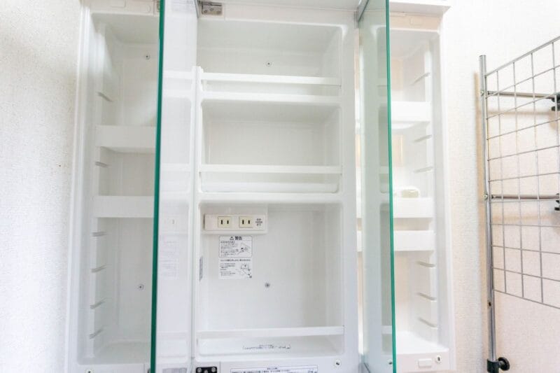 以前の洗面台と幅は同じでも、引き出しや三面鏡裏のキャビネットで収納力が格段にアップしています。