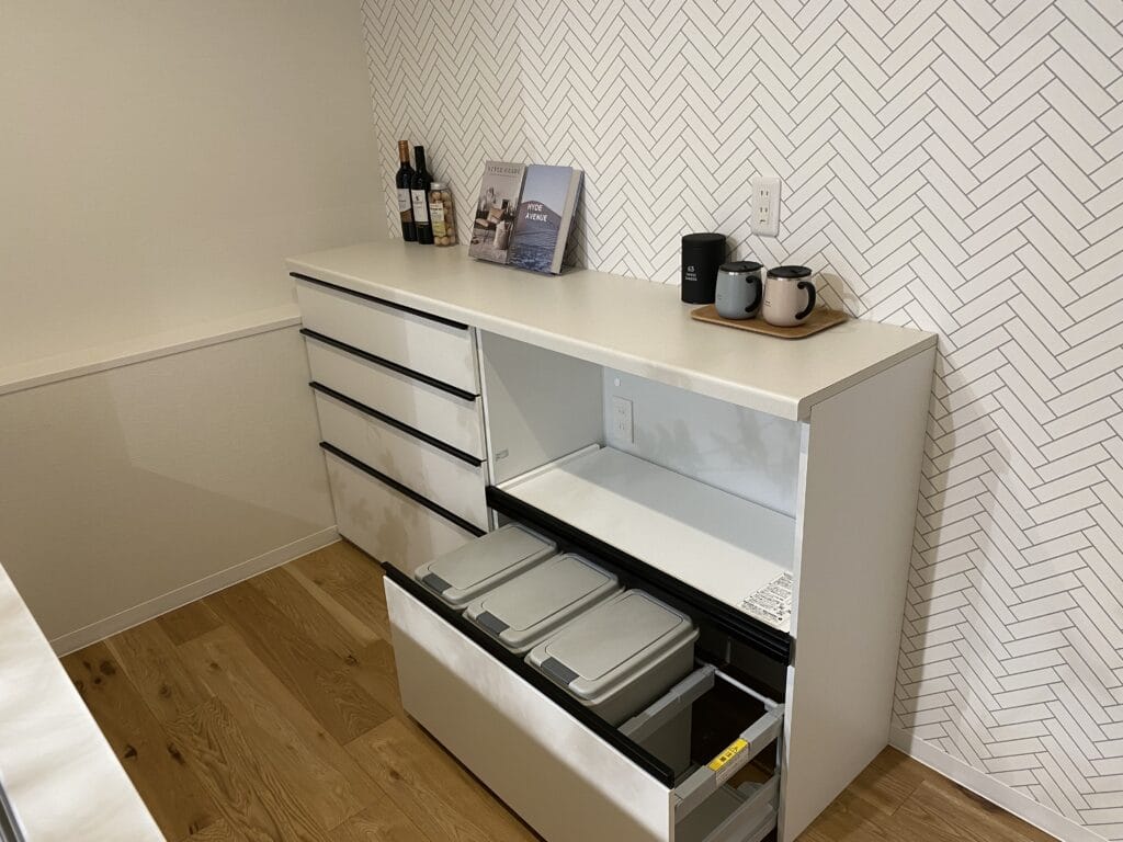背面側には調理器具・家電や食材の収納に便利なカップボードを新設しました。ダストワゴン付きでゴミ箱を収納でき、見た目もスッキリ。