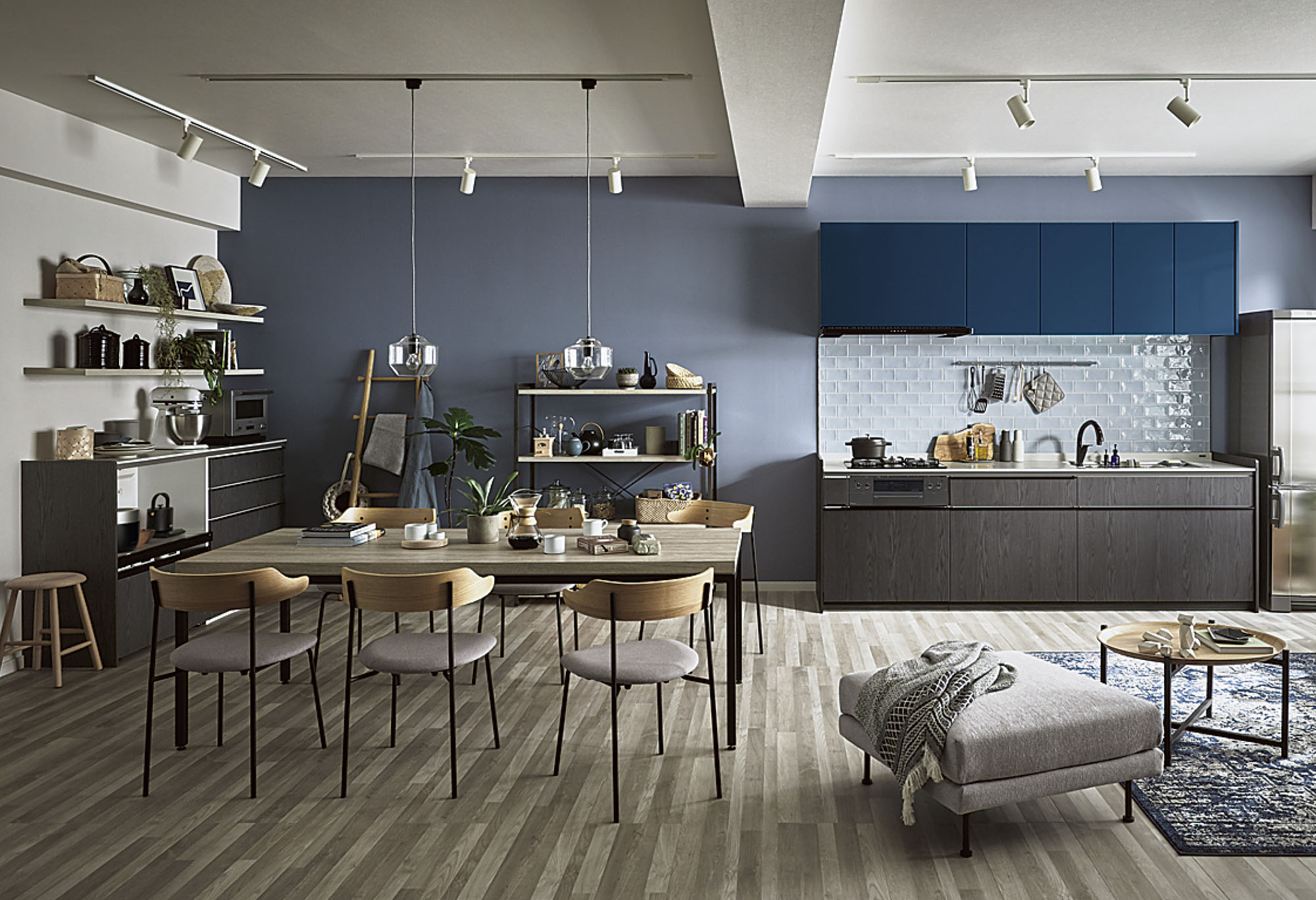 ・質感違いの扉面材を組合せたキッチンプラン。ビンテージ住宅におすすめ