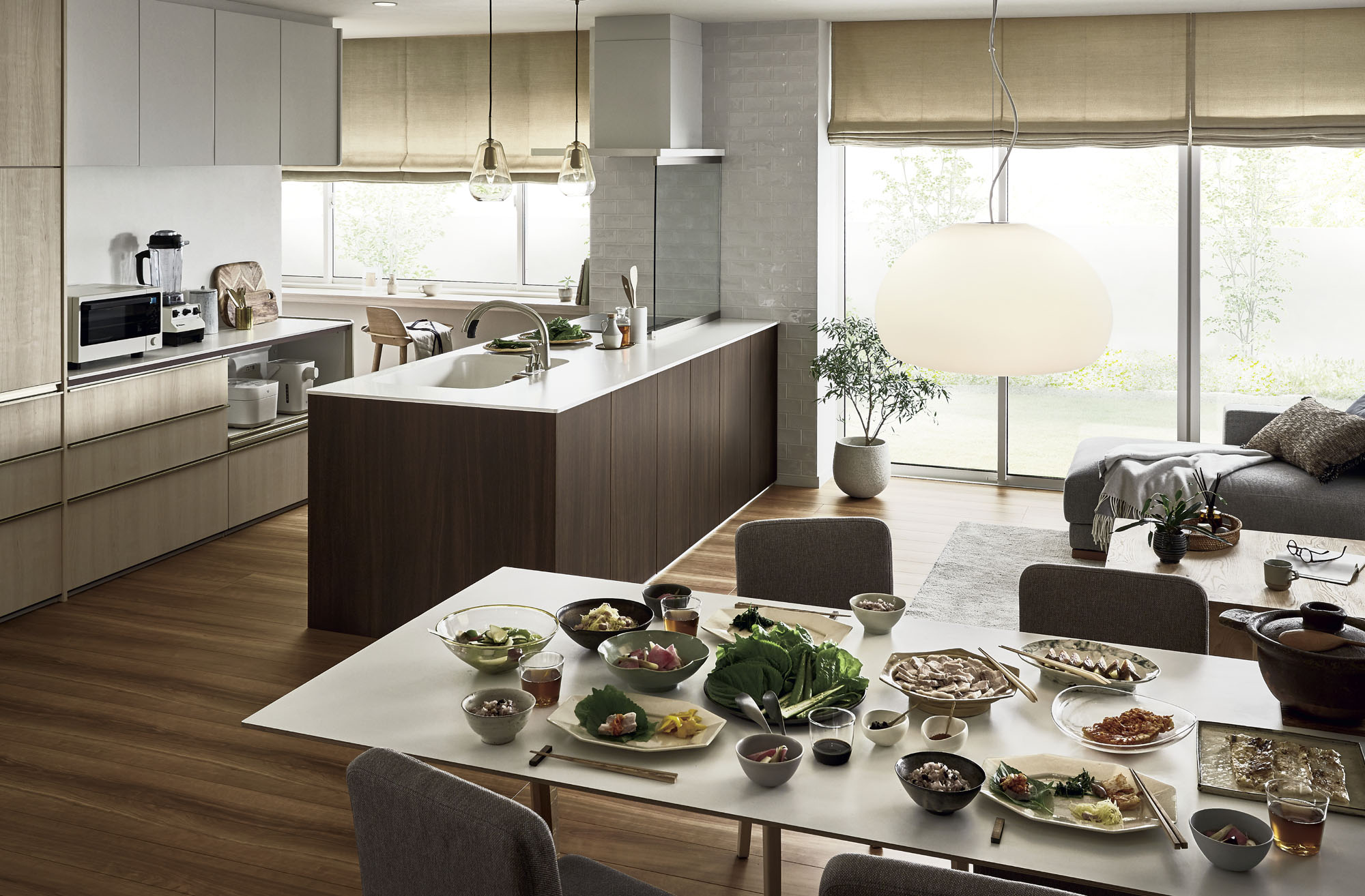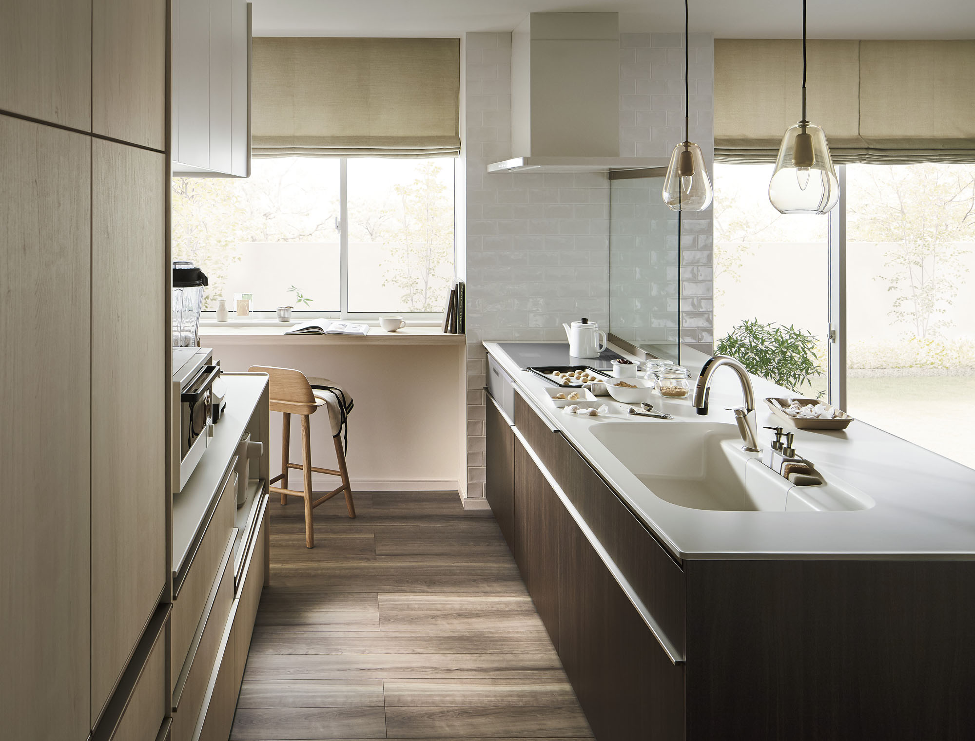 ・サイドマントルHVRレンジフード、3口IHヒーター、浄水器付きタッチレス水栓、人工大理石トップ、キレイシンクなど充実仕様のキッチン部