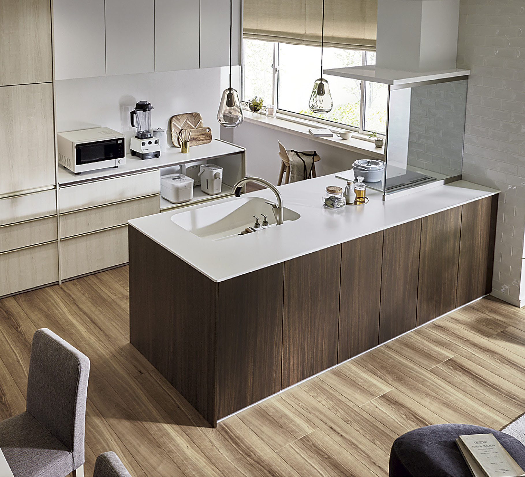 ・蒸気排出ユニット付き家電収納、人工大理石カウンターなど充実機能のワイド365cm大型カップボード部