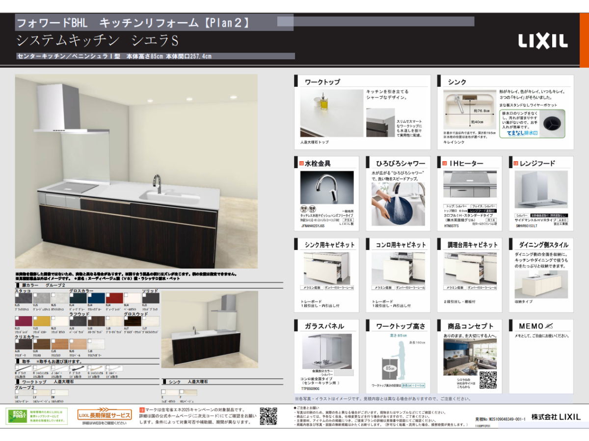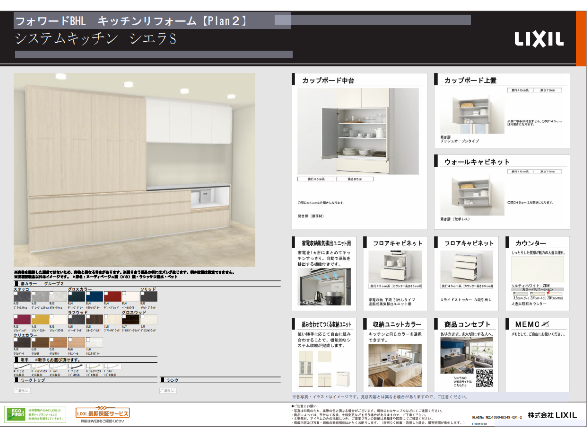 ・258cmセンターキッチン・ペニンシュラI型キッチンとワイド363cmカップボードの組合せ、工事費込みの価格