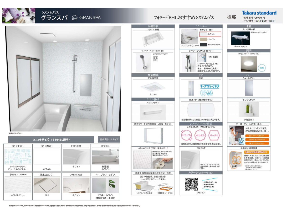 ・壁、天井、浴槽パンにたっぷりの保温材を標準装着、温まるやすく、さめにくい
